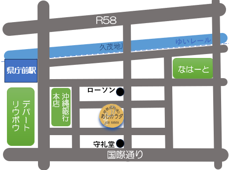 2016年4月27日 那覇市久茂地3丁目に沖縄1号店オープン! リラクゼーション専門店です。 国際通りより少し奥に入ったところにあり、路面店ですので お荷物が多くても立ち寄りやすいお店です。 お仕事帰りのお客様も旅行や出張のお客様も気軽にご来店下さい。 ご友人やパートナーとのご来店も大歓迎です。 落ち着いた雰囲気で癒しのひと時をお過ごしください。 ご予約はこちらへ 098-862-2323(ご予約専用)